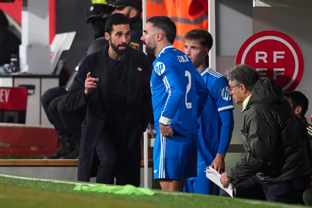 1月14日,皇家马德里队新任主教练阿尔瓦罗·阿韦洛亚(左一)在比赛中指导球员卡瓦哈尔(左二)。新华社发