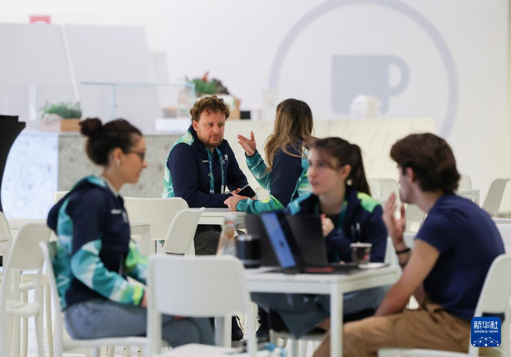 1月28日,工作人员在主媒体中心餐厅区域休息、交流。