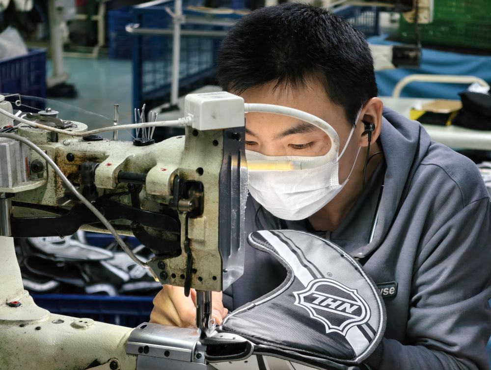 厦门博特运动器材有限公司的生产线上,印有“NHL”标识的头盔和手套正批量出货。公司总经理叶小玲表示,北美市场占公司出口额的一半,预计2025年出口增长12%至15%。