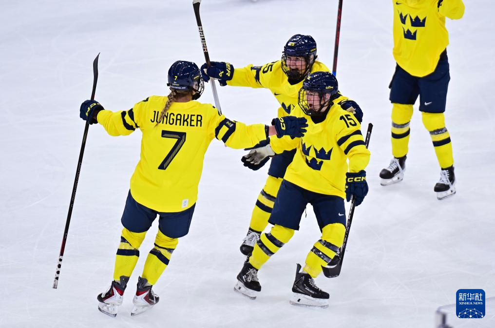 2月5日,瑞典队球员在比赛中庆祝得分。
