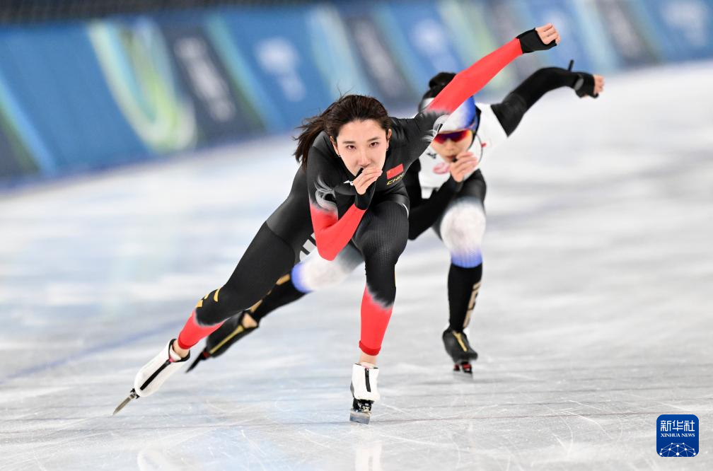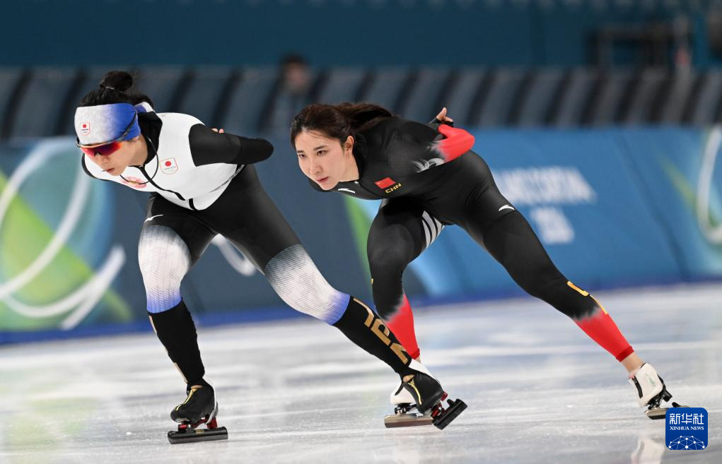 2月5日,中国速度滑冰运动员韩梅(前)和日本速度滑冰运动员高木美帆在训练中。