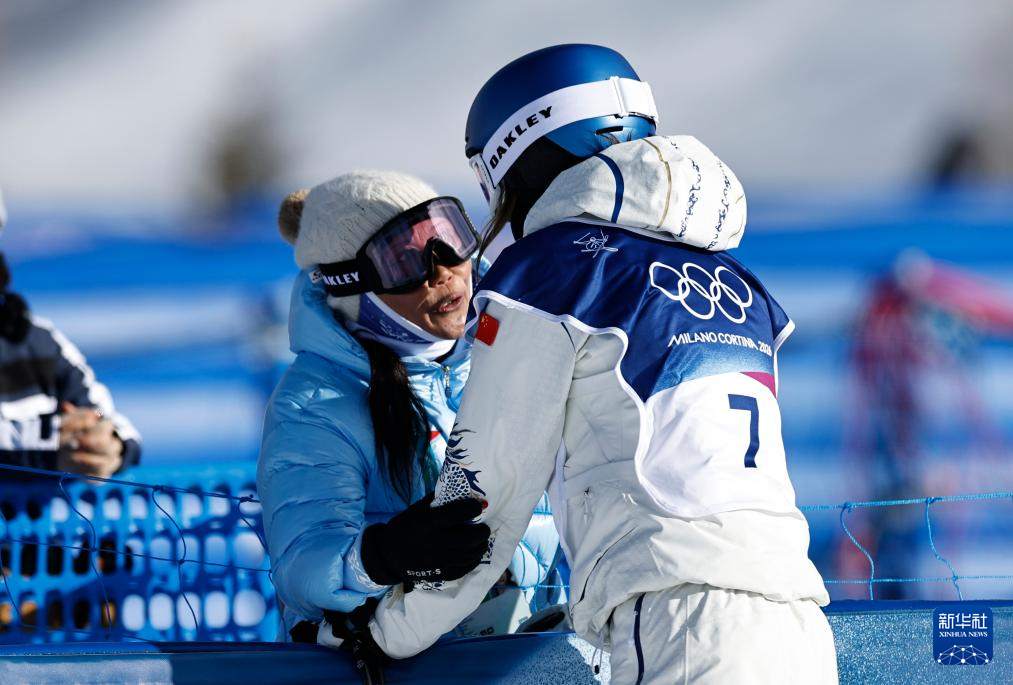 2月7日,谷爱凌(右)在比赛中和母亲交流。