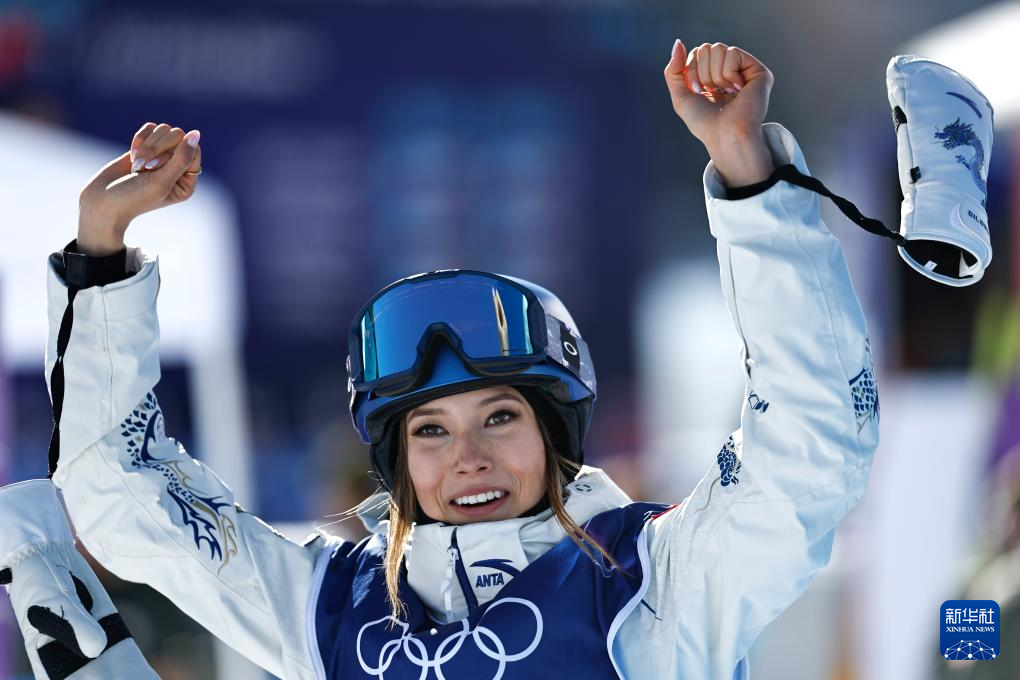 2月7日,谷爱凌在试跳后庆祝。