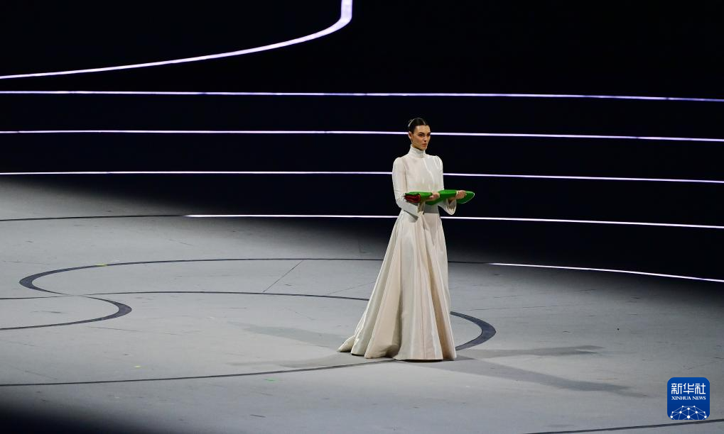 2月6日,模特维多利亚·切蕾蒂在开幕式上手捧意大利国旗入场。