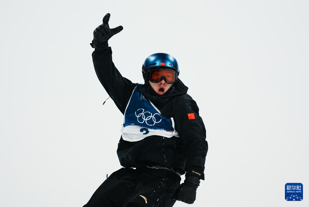 2月7日,中国选手苏翊鸣在第一跳后庆祝。