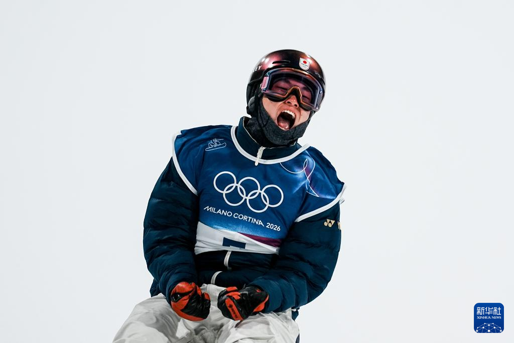 2月7日,日本选手木俣椋真在比赛中庆祝。他获得亚军。