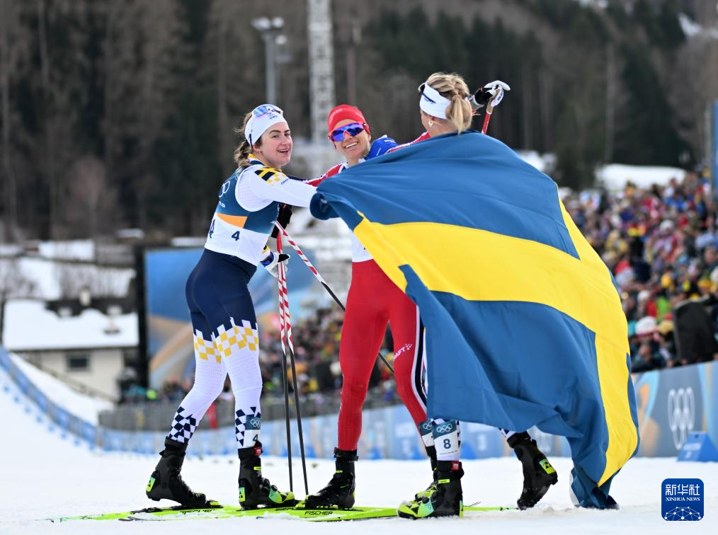 2月7日,冠军瑞典选手弗里达·卡尔松(右)、亚军瑞典选手埃芭·安德松(左)与季军挪威选手海迪·文格在比赛后庆祝。