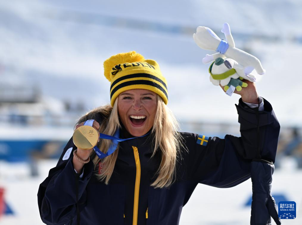2月7日,冠军瑞典选手弗里达·卡尔松在颁奖仪式上展示奖牌。