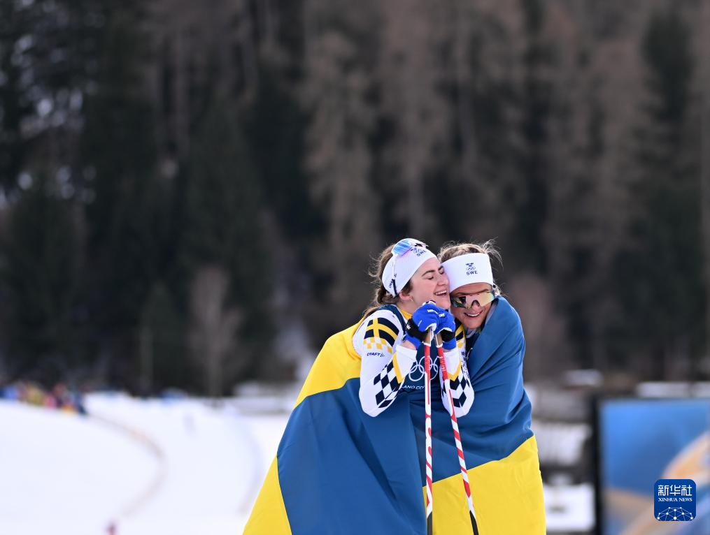 2月7日,亚军瑞典选手埃芭·安德松(左)冲线后与冠军瑞典选手弗里达·卡尔松庆祝。