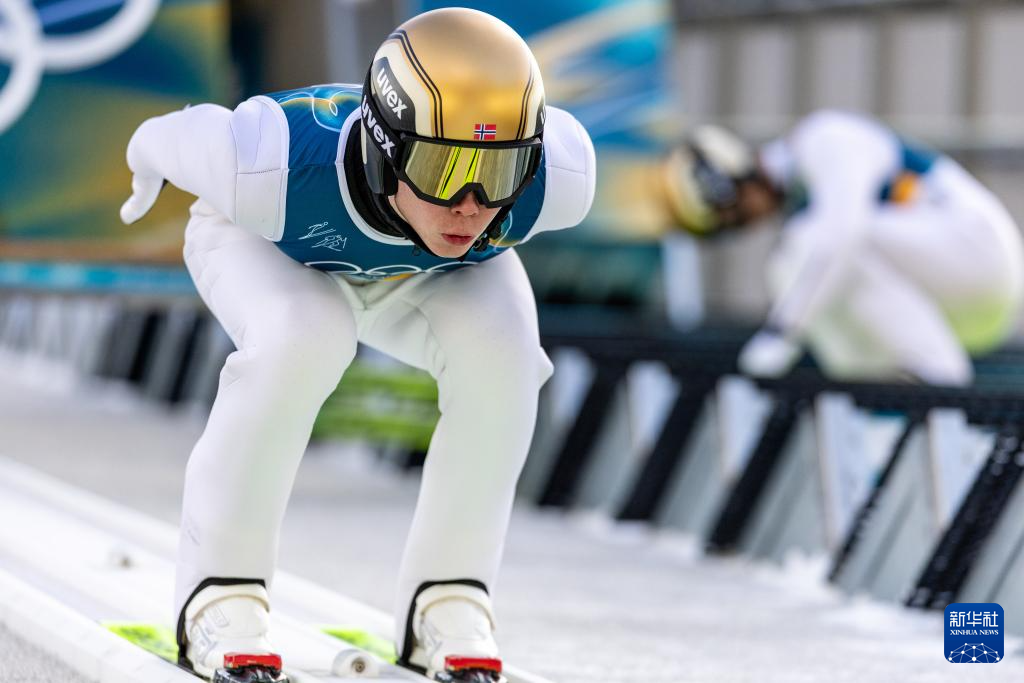 2月17日,挪威选手奥夫特布罗在个人大跳台比赛轮中。