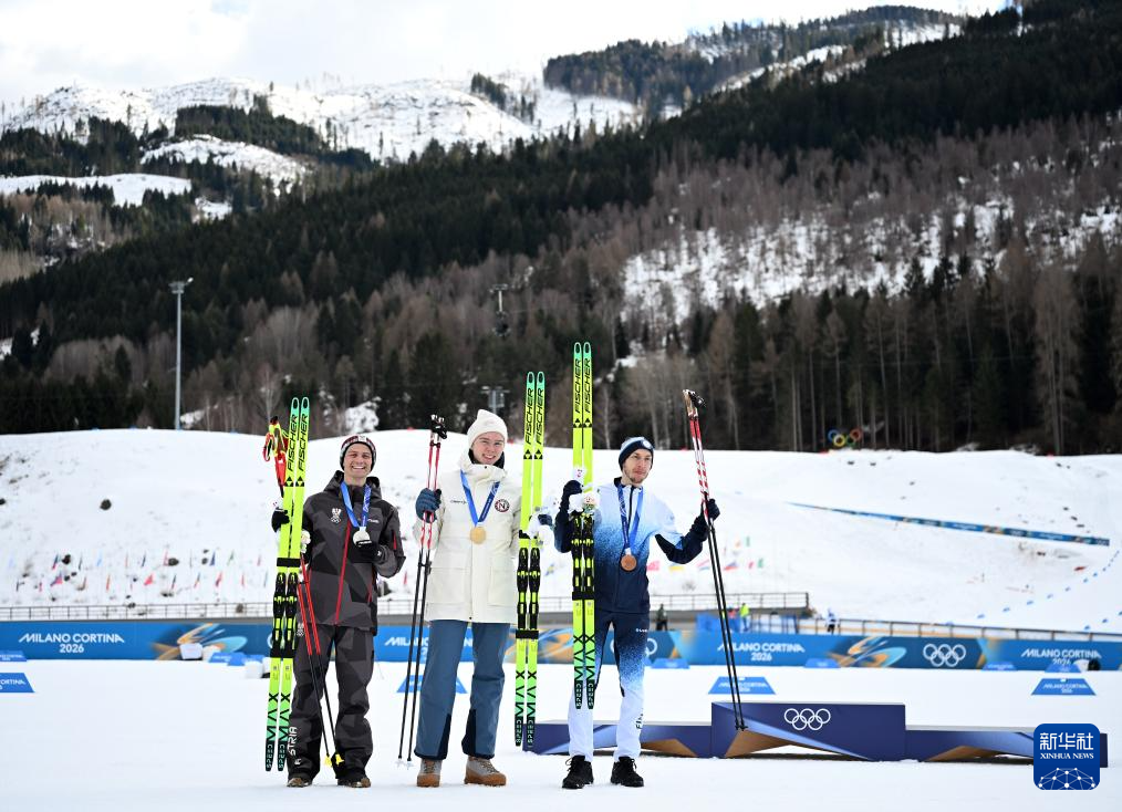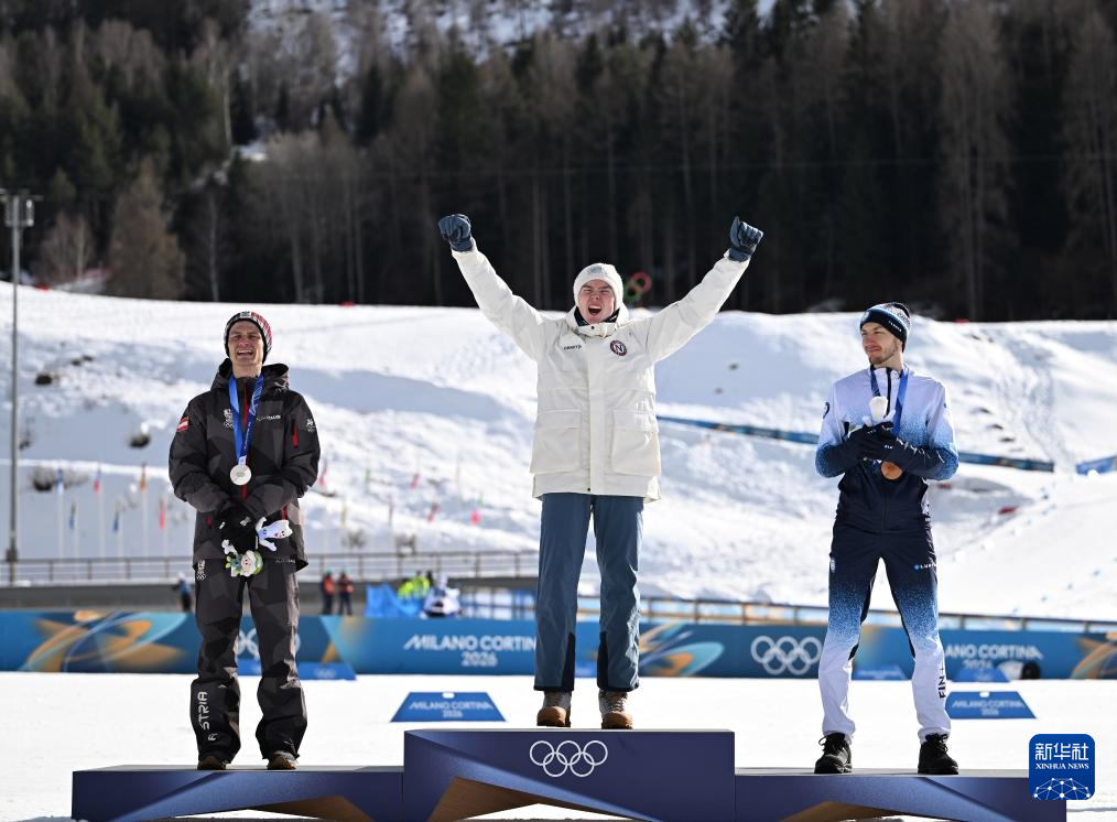 2月17日,冠军挪威选手奥夫特布罗(中)、亚军奥地利选手兰帕特尔(左)和季军芬兰选手海罗拉在颁奖仪式上。