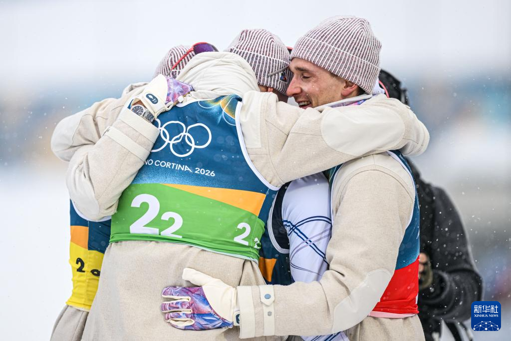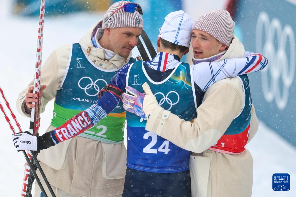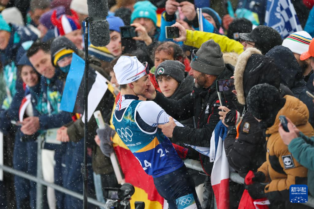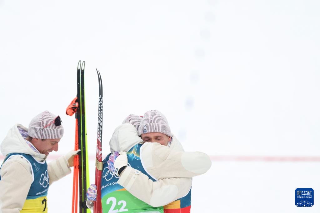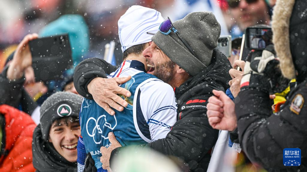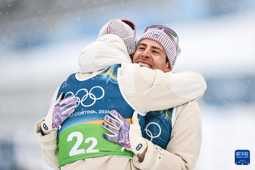 2月17日,法国队选手法比安·克洛德(右)在终点线和队友拥抱。