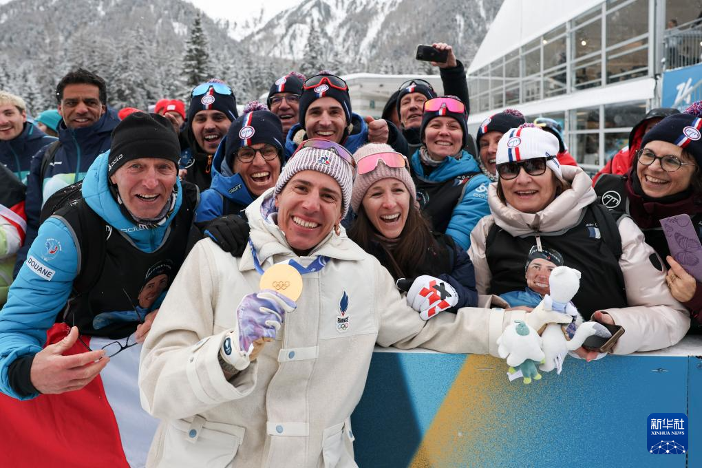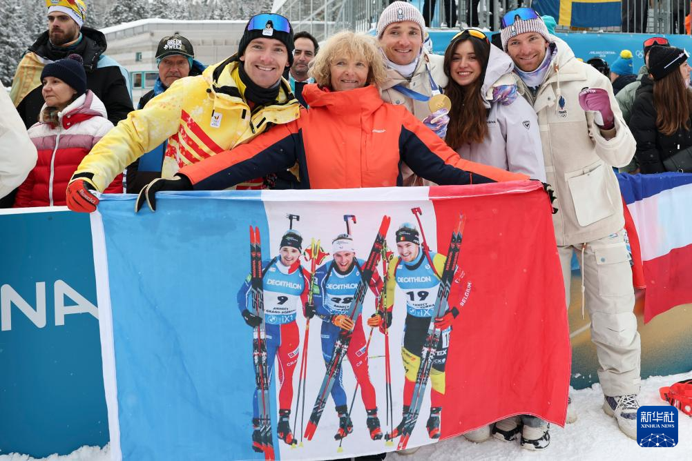 2月17日,法国队选手康坦·菲永·马耶(前)在颁奖仪式后和家人庆祝。