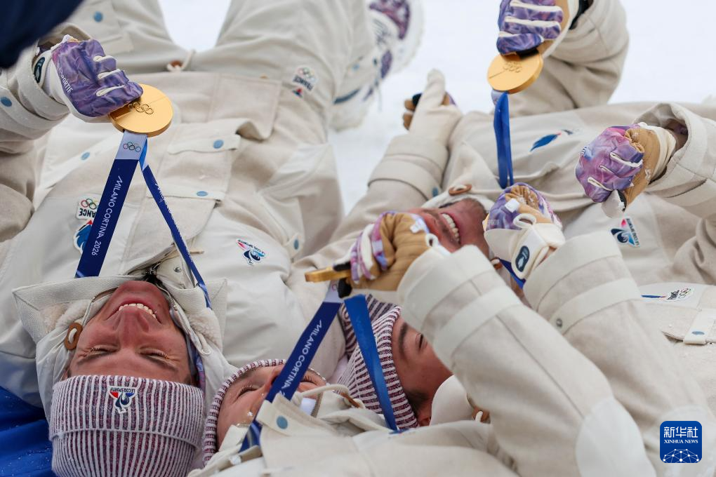 2月17日,冠军法国队在颁奖仪式后躺在地上庆祝。
