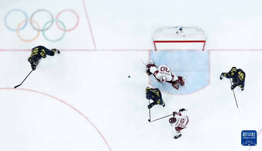 当地时间2月17日,在意大利米兰举行的米兰-科尔蒂纳冬奥会冰球项目男子资格附加赛中,瑞典队5比1战胜拉脱维亚队。