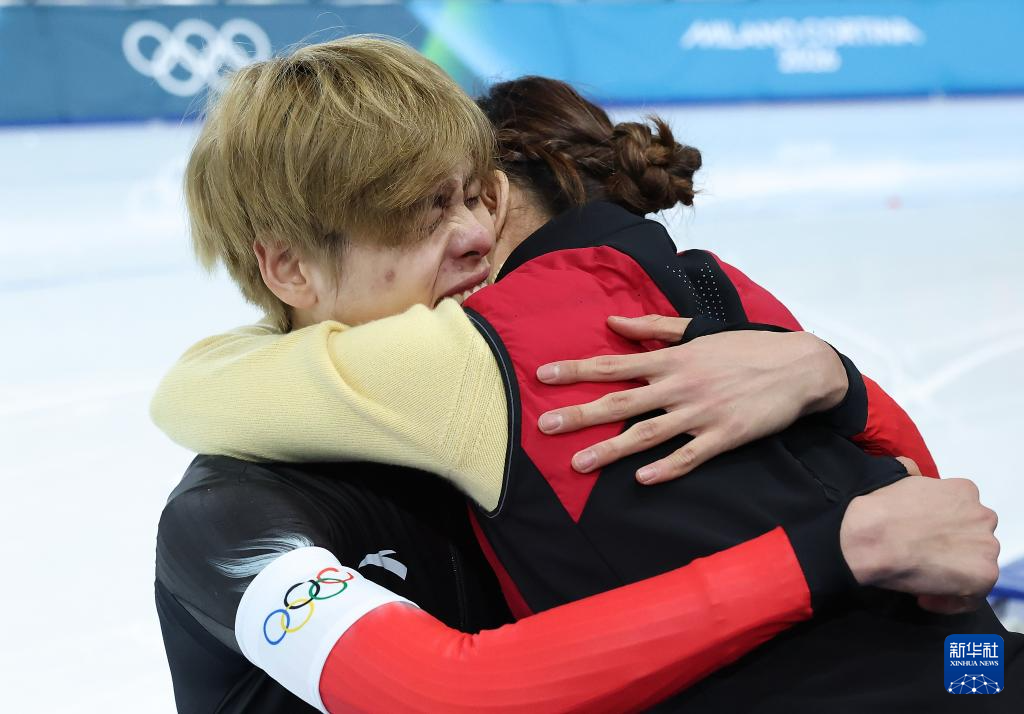 2月17日,中国队选手李文淏(右)和刘瀚彬在赛后拥抱。