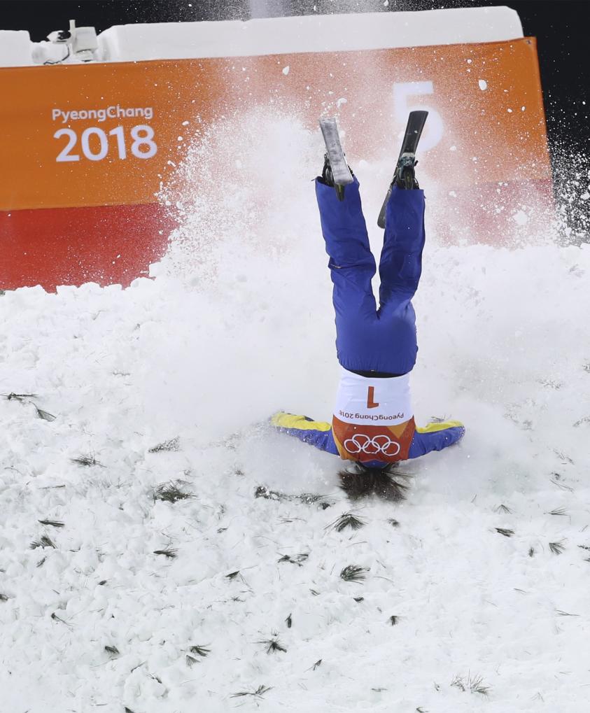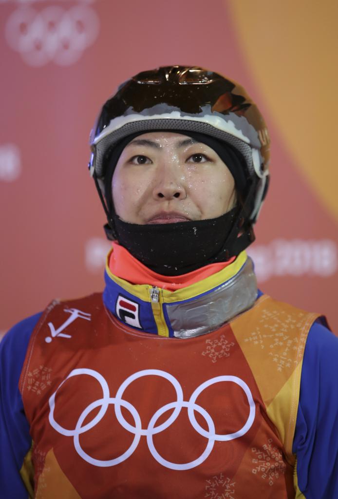 2018年2月16日,徐梦桃在平昌冬奥会自由式滑雪女子空中技巧决赛中发生失误。 新华社记者 李钢 摄