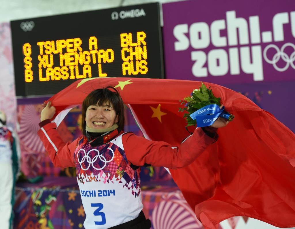 2014年2月14日,徐梦桃在索契冬奥会自由式滑雪女子空中技巧决赛中。新华社记者 费茂华 摄