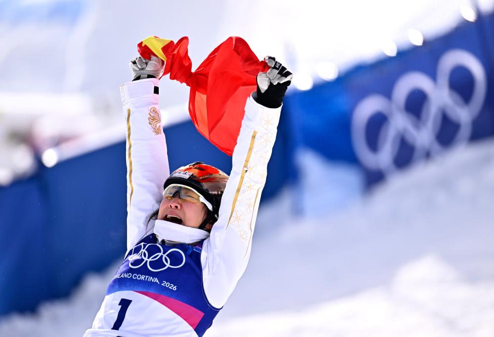 2026年2月18日,徐梦桃在米兰冬奥会自由式滑雪女子空中技巧决赛后庆祝夺冠。新华社记者 张宏祥 摄