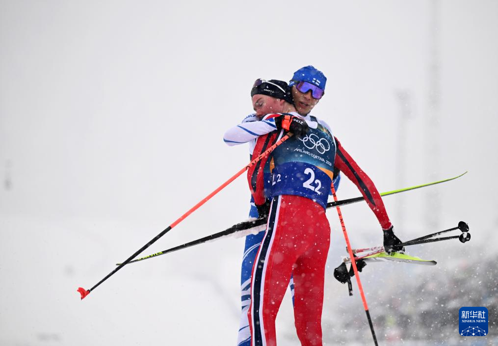 2月19日,挪威队选手奥夫特布罗(前)与芬兰选手希尔沃宁在冲线后拥抱。