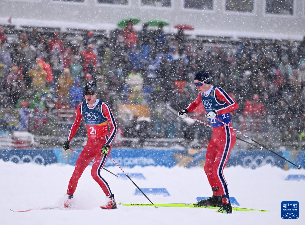 2月19日,挪威队选手斯科格隆(左)与奥夫特布罗在比赛中交接。