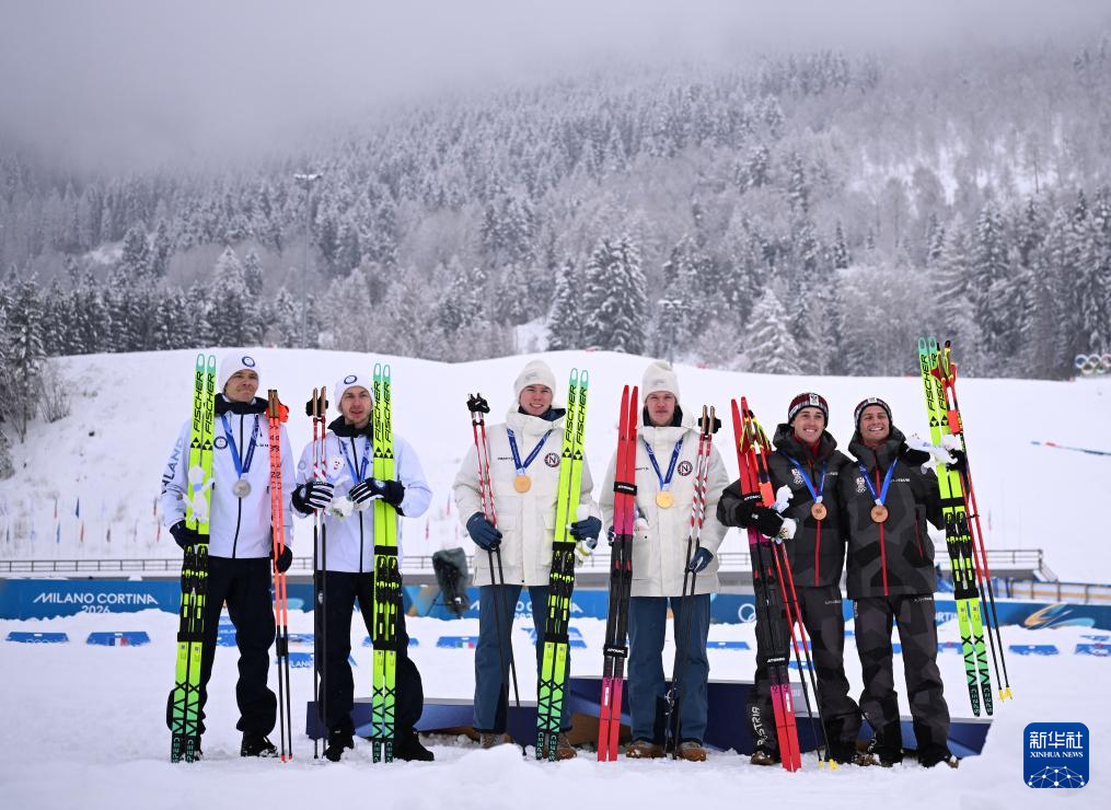2月19日,冠军挪威队选手奥夫特布罗(右四)与斯科格隆(右三)、亚军芬兰队选手海罗拉(左二)与希尔沃宁(左一)、季军奥地利队选手兰帕特尔(右一)与雷滕格(右二)在颁奖仪式上。