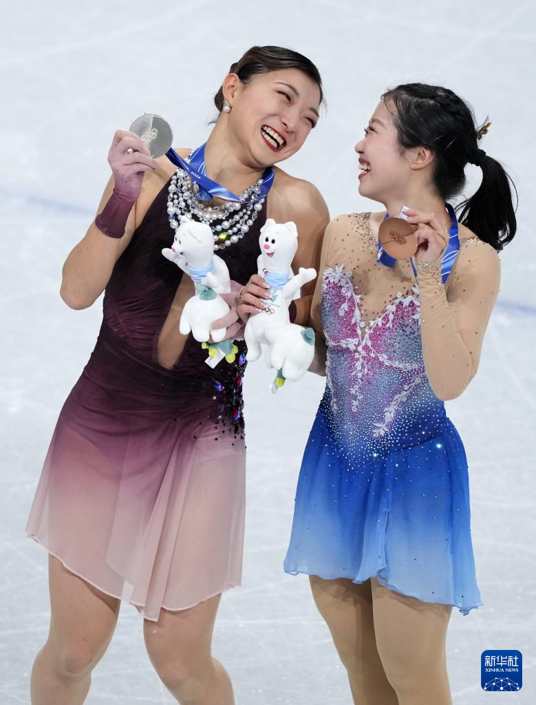 2月19日,获得亚军和季军的日本选手坂本花织(左)、中井亚美在颁奖仪式上。