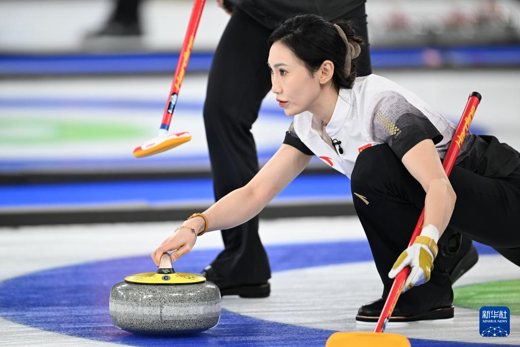 2月19日,中国队选手韩雨(中)在比赛中掷壶。