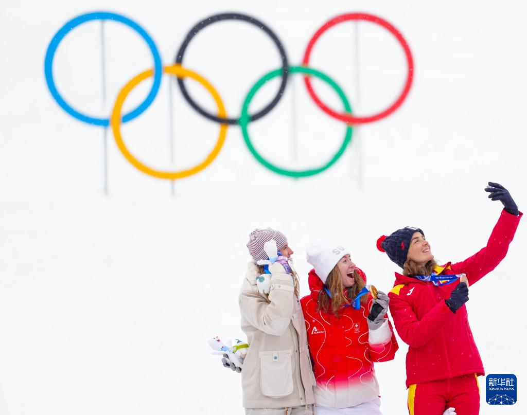 2月19日,冠军瑞士选手法东(中)、亚军法国选手哈罗普(左)和季军西班牙选手阿隆索·罗德里格斯在比赛后庆祝。