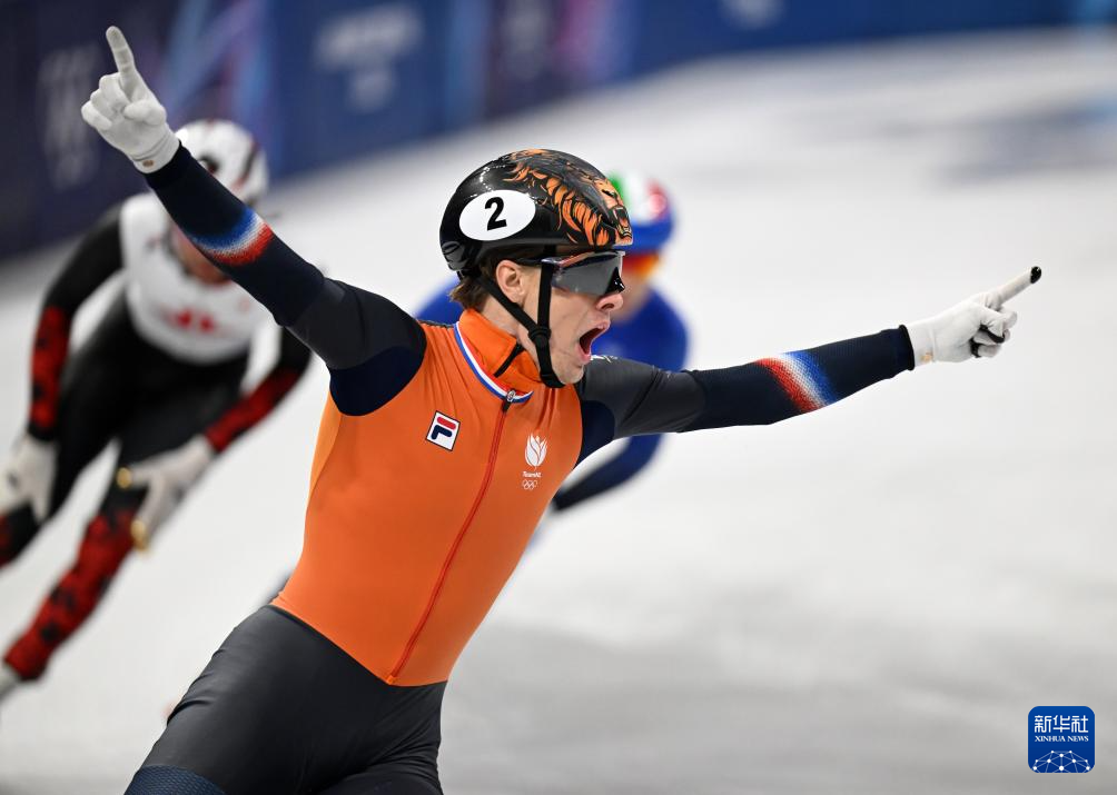 2月20日,荷兰队选手延斯·范特·沃特(右下)在冲线后庆祝。