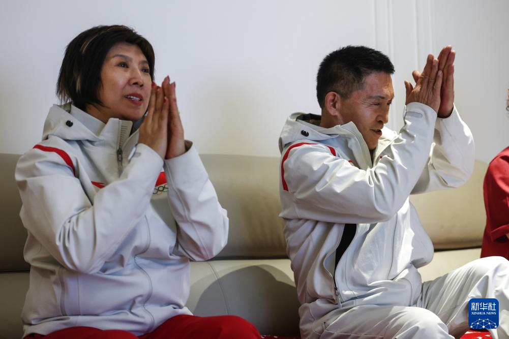 2月21日,徐梦桃母亲王凤丽(左)、父亲徐学君在观看比赛直播。