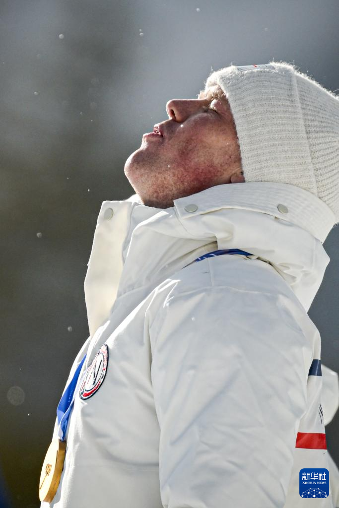 2月20日,季军法国选手康坦·菲永·马耶在颁奖仪式上庆祝。