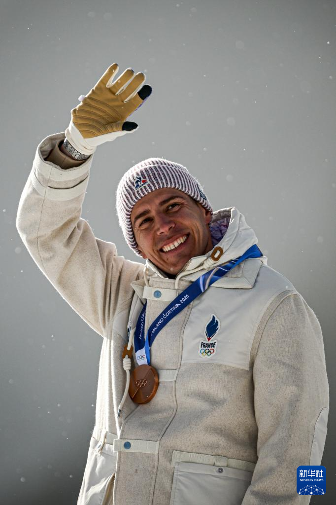 2月20日,季军法国选手康坦·菲永·马耶在颁奖仪式上向观众致意。
