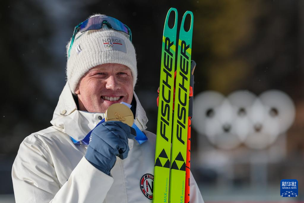 2月20日,亚军挪威选手斯图拉·霍尔姆·莱格雷德在颁奖仪式上庆祝。