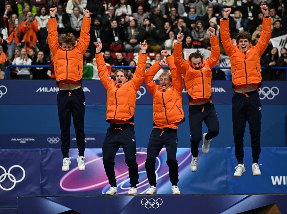 2月20日,冠军荷兰队在男子5000米接力颁奖仪式上。新华社记者 程敏 摄