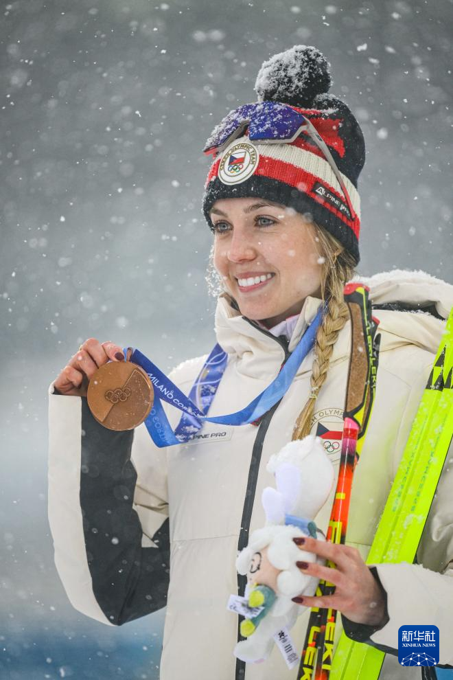 2月21日,季军捷克选手沃博尔尼科娃在颁奖仪式上庆祝。