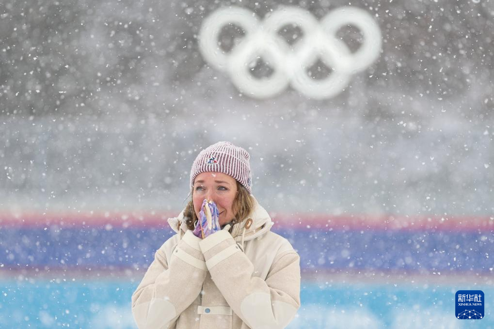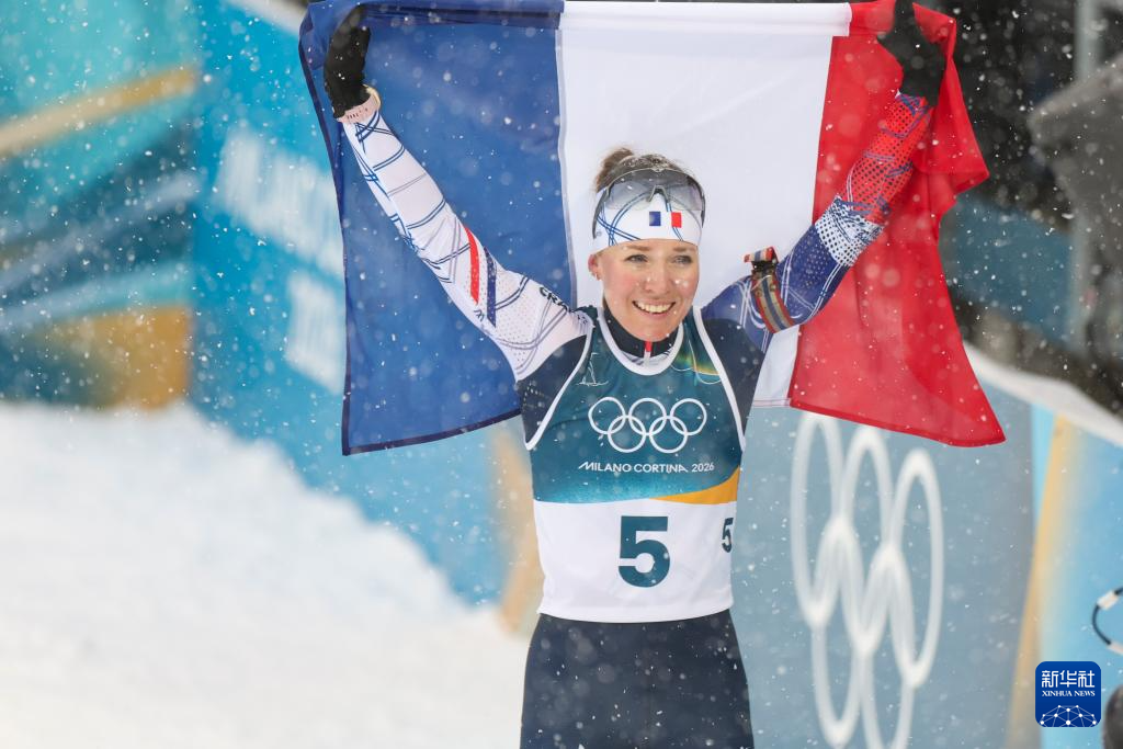 2月21日,法国选手米舍隆在终点处庆祝。她获得冠军。
