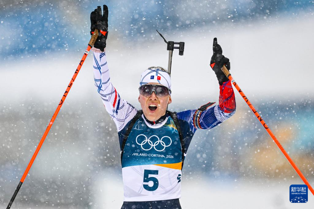 2月21日,法国选手米舍隆在终点处庆祝夺冠。
