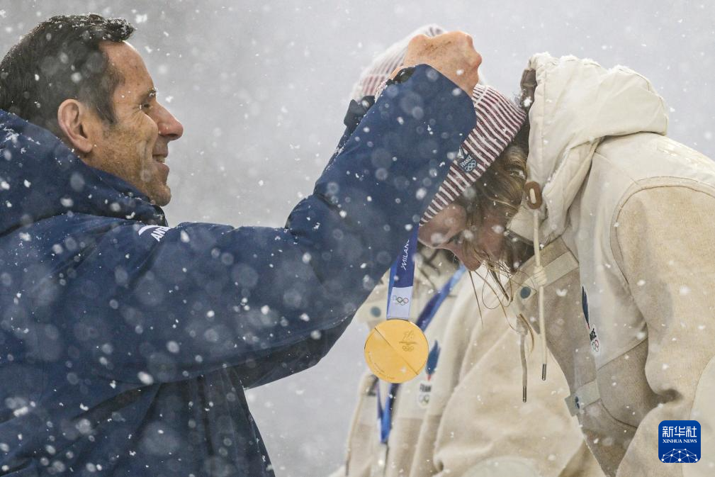 2月21日,冠军法国选手米舍隆(右)在颁奖仪式佩戴金牌。
