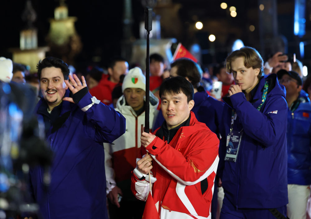 ↑中国自由式滑雪运动员齐广璞(中)在闭幕式入场。