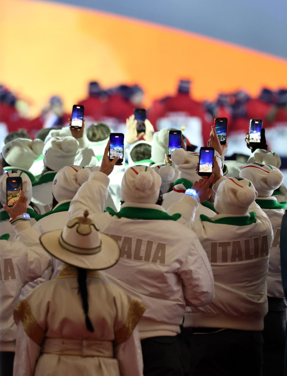 ↑意大利国旗与国际奥委会会旗在闭幕式现场升起。