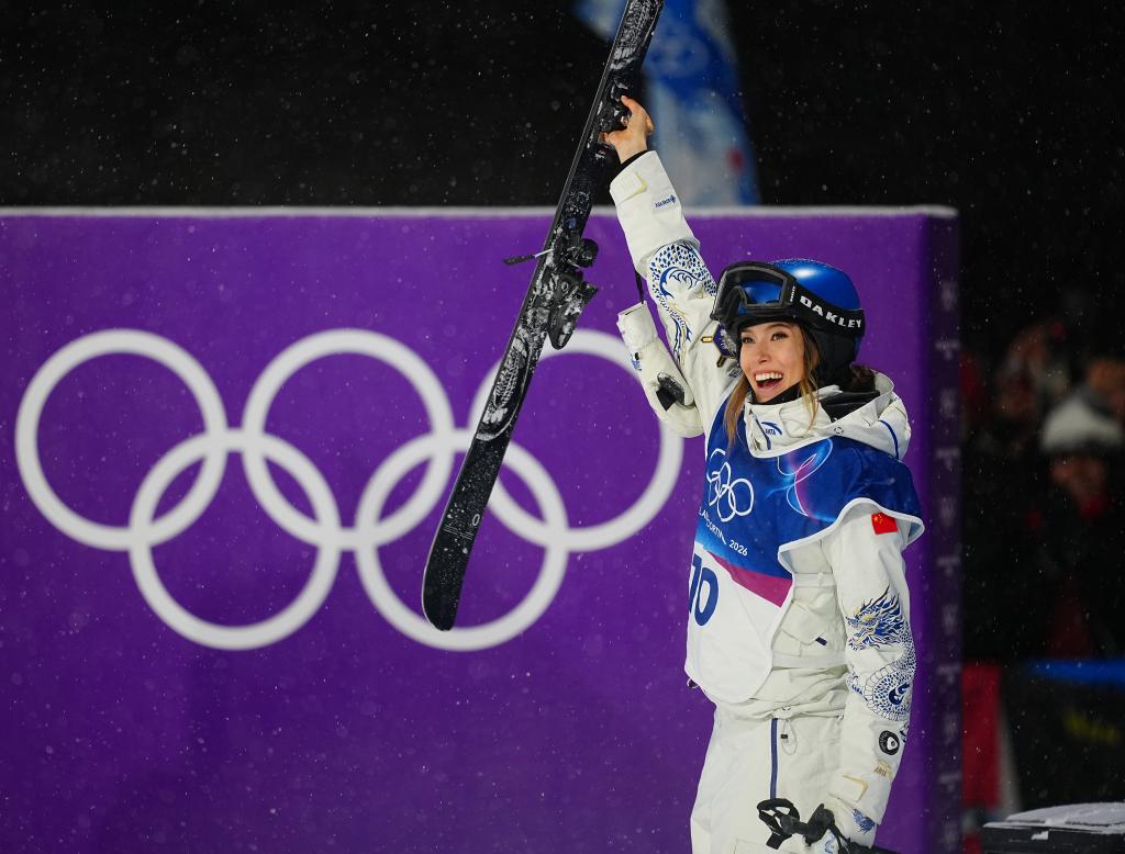 2月16日,中国选手谷爱凌在比赛后庆祝。新华社记者 胡超 摄