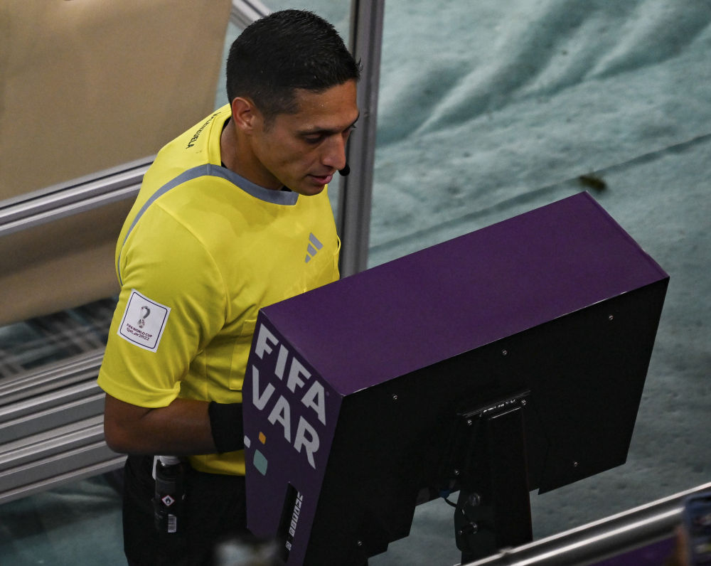 图为2022年卡塔尔世界杯法国队与波兰队的八分之一决赛中,主裁判在比赛中查看VAR(视频助理裁判)。新华社记者 夏一方 摄