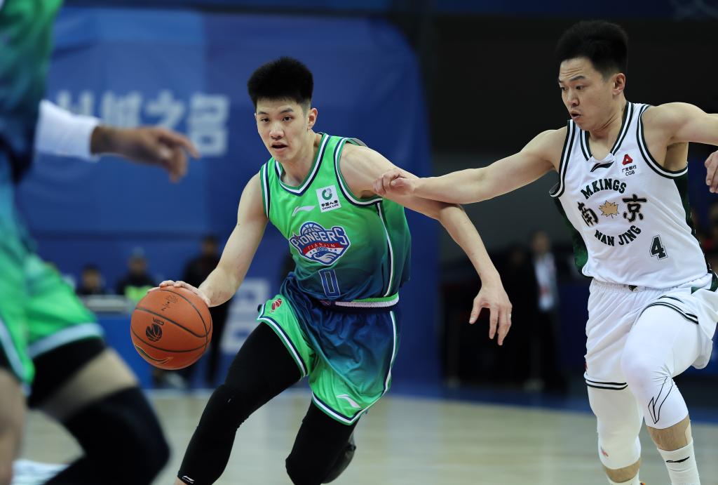 林庭谦(左)在CBA比赛中。新华社记者 孙凡越 摄