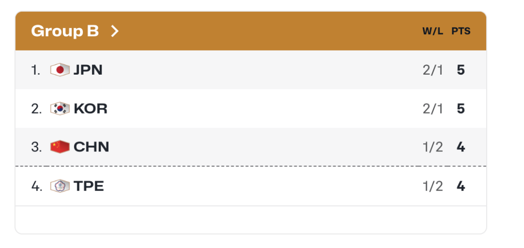 中国队、中国台北队1胜2负