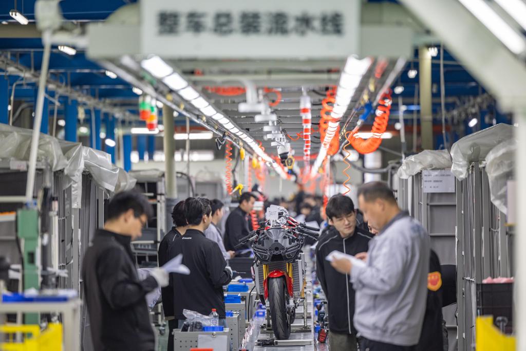 2026年4月1日,工作人员在重庆两江新区“张雪机车”生产车间整车总装流水线上作业。