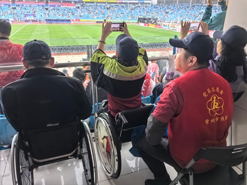 看台上一处特别的角落引人注目。那里,坐着25位残疾人球迷和30位志愿者。他们身着红色常州队球迷服,头戴蓝色帽子,组成一个“残健同心”的方阵。位置视野开阔,能俯瞰整个绿茵场上的每一次拼抢、每一脚传球。