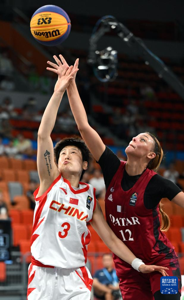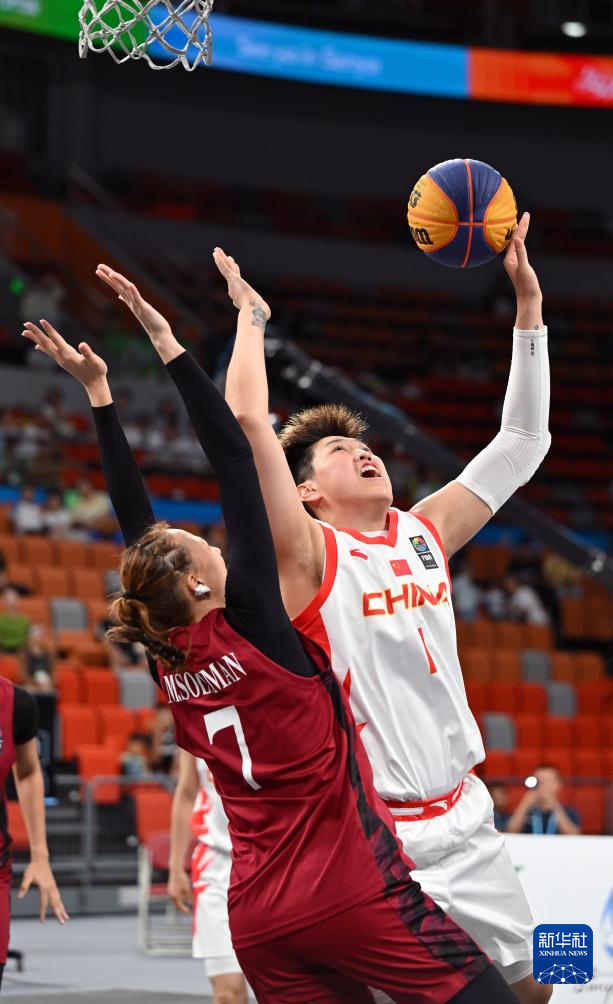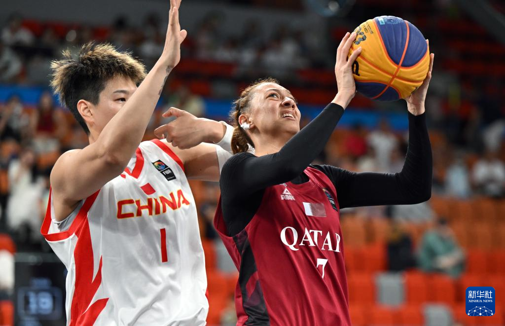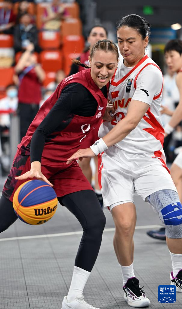 4月25日,在海南三亚举行的第六届亚洲沙滩运动会三人篮球女子小组赛中,中国队21比5战胜卡塔尔队。