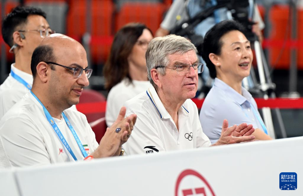 4月25日,国际奥委会终身名誉主席巴赫(中)现场观赛。