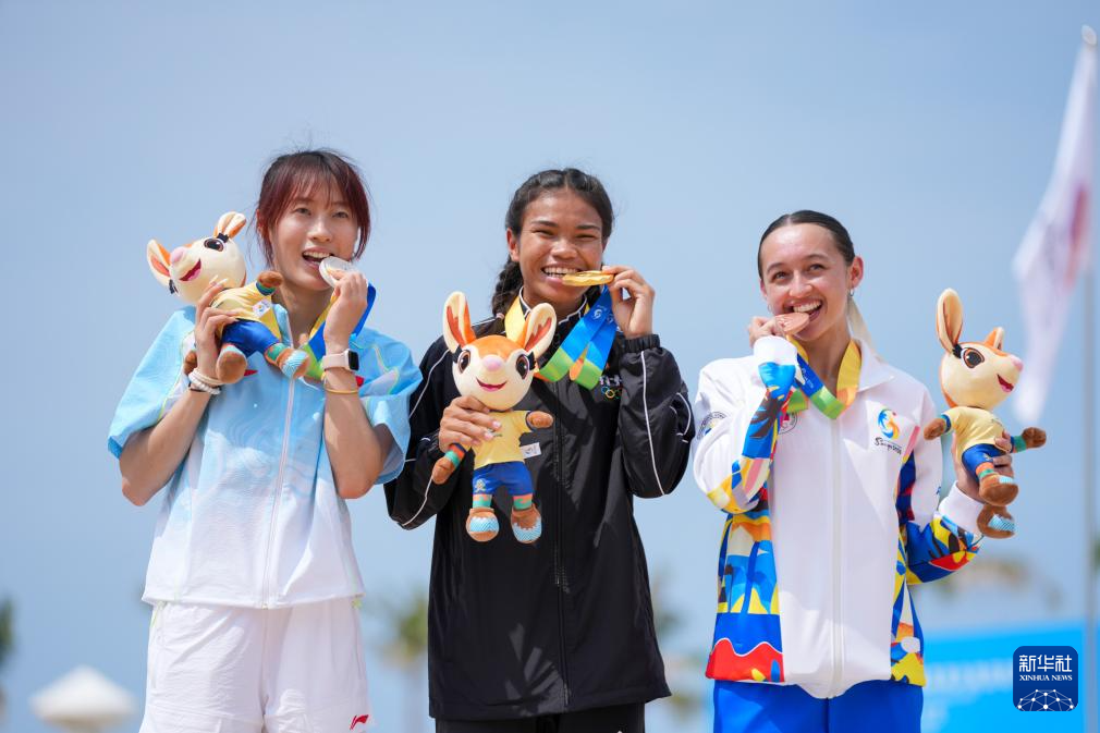 4月25日,冠军泰国选手吉拉帕·卡农塔(中)、亚军中国选手许佳璐(左)、季军菲律宾选手杰西卡·罗斯·劳伦斯在颁奖仪式上。